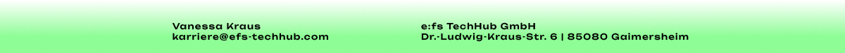 Die e:fs TechHub GmbH ist strategischer Partner für die Entwicklung überlegener Zukunftstechnologien und Softwarelösungen im Bereich der Mobilität und darüber hinaus. Wir vereinen höchste Qualität und Innovationskraft mit positiver Energie und Zusammenarbeit auf Augenhöhe.